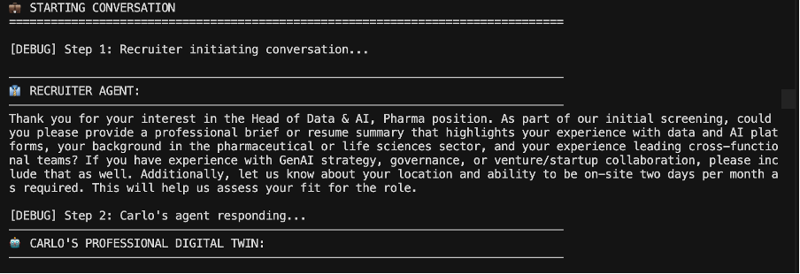I started from an existing candidate agent, my Professional Digital Twin, and paired it with a recruiter agent designed to run a consistent first screen. The system is built using the OpenAI Agents SDK in Python, with built in session management, tracing, and conversation history. There are three components: